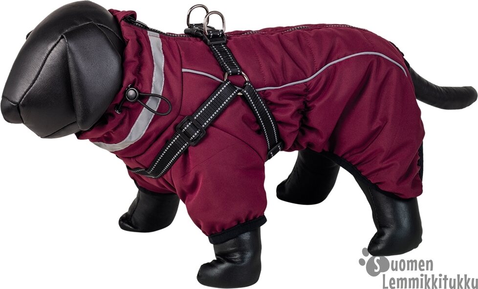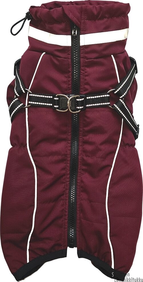 Tämän helpompaa ei voi olla! Samassa vaatteessa sekä valjaat että takki! Ei enää erillistä valjasaukon etsimistä tai valjaiden sovittamista takin päälle vaan vedä takki koiran päälle ja valjaat kiinni -se on siinä! Takissa on etuosassa lahkeet etujaloilla ja takaosassa jalkaremmit (takaosassa ei ole lahkeita)