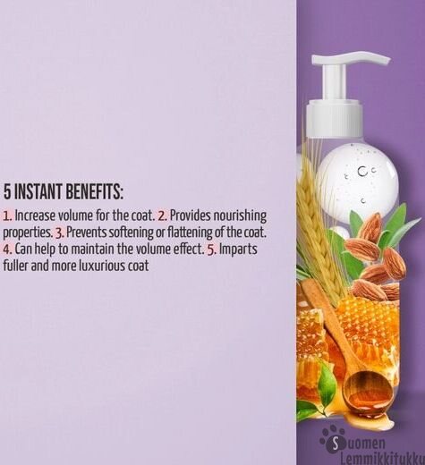 Auttaa palauttamaan turkin luonnollisen kiillon, tekee siitä terveemmän, kimmoisamman ja ravitsevilla aineilla rikastetun. Hoitoaine estää turkin latistumista, antaa sille enemmän volyymia ja tekee siitä paljon pehmeämmän.