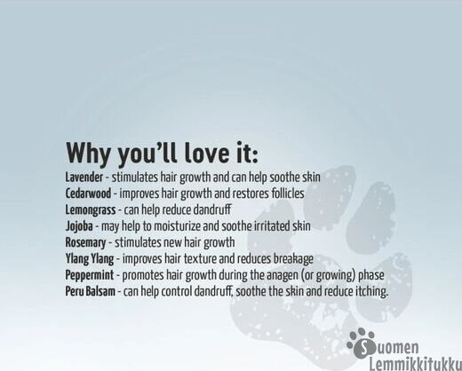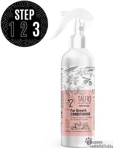 Tauro Pro Line Pure Nature -tuotteet ovat luonnon inspiroimia ja sisältävät korkealaatuisia luonnollisia ainesosia, jotka auttavat huolehtimaan lemmikkisi turkista ja ihosta entistä paremmin. Fur Growth -koostumus sisältää 8 ainutlaatuista luonnollista ja eteeristä öljyä, jotka tehokkaasti edistävät karvankasvua, vähentävät karvan katkeilua ja stimuloivat karvatuppia tehden turkista paksumman ja terveemmän näköisen. Aktiiviset aineet ravitsevat lemmikin turkkia ja ihoa tunkeutumalla syvemmälle kerroksiin, vahvistaen jopa vastikasvaneen karvan – tehden siitä vahvaa, pörröistä ja kiiltävää. Hoitoaine kosteuttaa karvaa niin, että se on elastista, katkeilee vähemmän ja on tiheämpää. Koostumuksessa ei ole parabeeneja, SLS:ää eikä silikoneja, joten se sopii myös kaikkein herkimpiin lemmikkeihin.