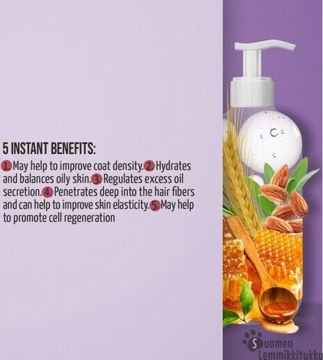 Hellävaraisen koostumuksensa ansiosta shampoo on ihanteellinen lemmikkieläimille, joilla on herkkä iho: se on valmistettu ilman SLS:ää, parabeeneja, mineraaliöljyjä ja silikoneja.