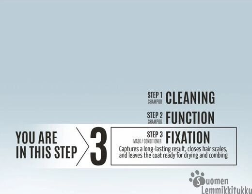 KÄYTTÖOHJEET: laimenna hoitoaine veteen suhteessa 1:10. Hiero hellästi turkkiin. Anna vaikuttaa noin 3 minuuttia. Huuhtele huolellisesti lämpimällä vedellä.