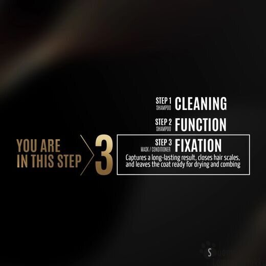 Laimenna maski haalealla vedellä suhteessa 1:10, kostuta turkki ja levitä tuotetta. Hiero noin 3 minuuttia ja huuhtele hyvin haalealla vedellä. Vain ulkoiseen käyttöön. Pidä poissa lasten ulottuvilta.