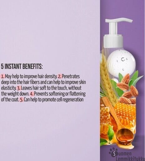 Tuotteen sisältämä makea manteliöljy on erityisen hyödyllinen: Se pehmentää ja ravitsee ihoa, voi vähentää karvojenlähtöä, antaa turkille silkkisen kiillon ja parantaa karvojen joustavuutta.