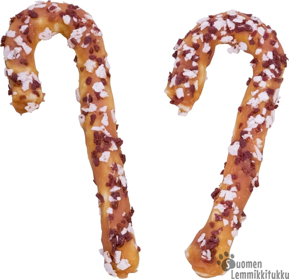 Herkullisella kanafileellä kuorrutetut muhkeat naudanvuotaiset "karkkikepit" tarjoavat koiralle paitsi jouluisen puruelämuksen. Mehevä kanafilee pinnassa houkuttelee koiraa puruhommiin.