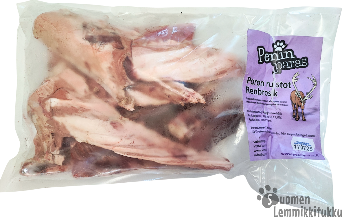 Penin Paras poron rustot sisältää kotimaisia poron rinta-, selkä- ja kylkirustopaloja. Pussissa on eri kokoisia paloja, mutta nämä eivät ole mitään pikkusilppua! Sopivat erityisesti pienille sekä keskikokoisille koirille hampaiden puhdistukseen ja aktivointirouskutteluun.