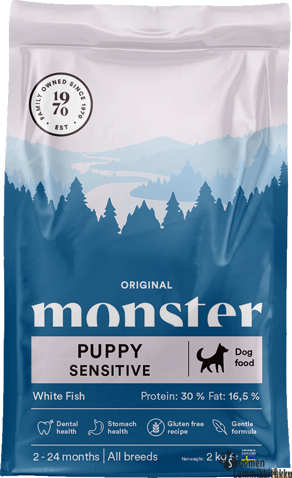 Monster Dog Original Puppy Sensitive White Fish on täysravinto, joka on suunniteltu etenkin herkkävatsaisille pennuille 2-24 kk ikään. Tämä kalaisa penturuoka sisältää valkolihaista kalaa ja tarjoaa pennullesi kaikki tarvittavat ravintoaineet vatsaystävällisessä muodossa. Näin pentusi vatsa toimii kunnolla ja pentu voi hyvin. Tuotteen sisältämät Omega Rasvahapot tukevat pennun oppimiskykyä ja kasvua.