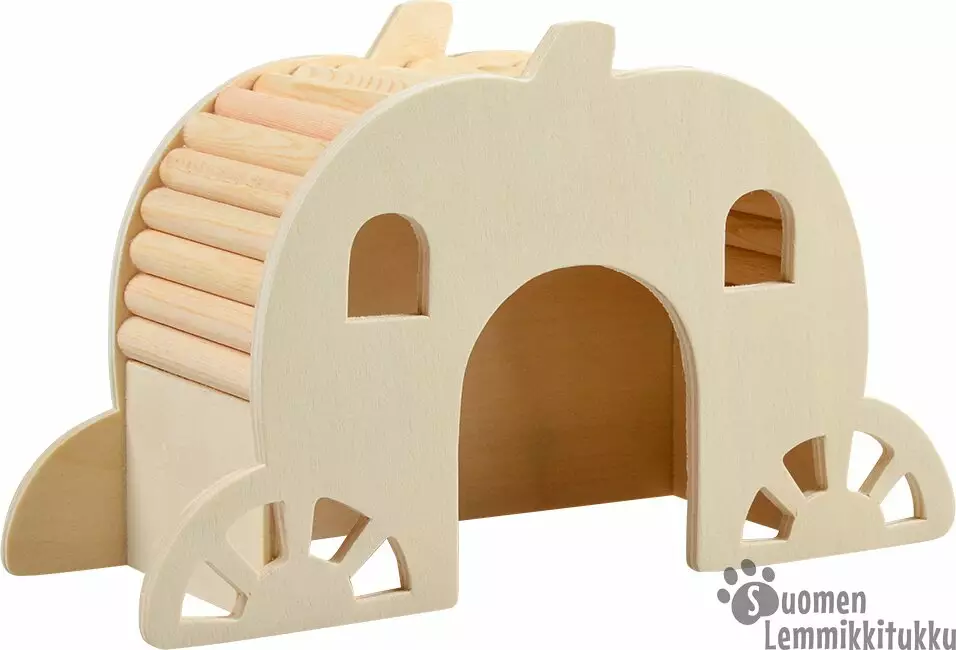 Hauska siltatalo, jossa voi asustella sekä kiipeillä katolla. Materiaali on käsittelemäntöntä puuta, joten sitä voi turvllisesti myös nakerrella, jos sille päälle sattuu.