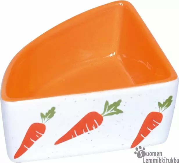 Keraaminen ruokakuppi, jonka voita laittaa tilaa säästävästi häkin nurkkaal. Kupin ulkopuoli on valkoinen oransseilla porkkanakuvioilla ja sisäpuoli on oranssi Kupin koko 9 x 9 x 4 cm, vetoisuus... Lue lisää