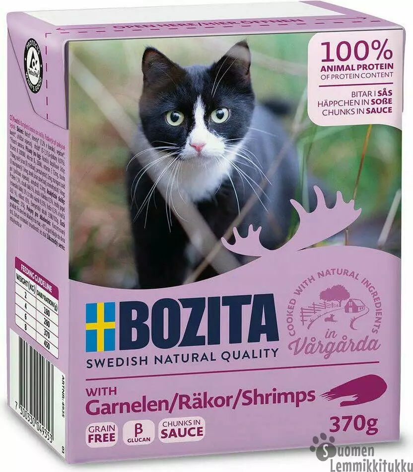Bozita Feline katkarapu on katkarapuja ja kanaa sisältävä täysravinto aikuisille kissoille. Bozita on erittäin korkealla lihapitoisuudella varustettu kissanruoka, joka on valmistettu puhtaista ruotsalaisista raaka-aineista. Ruoan korkea lihapitoisuus tekee siitä hyvin sulavaa ja maistuvaa. Bozita-ruoka sisältää kaikki kissan tarvitsemat vitamiinit ja mineraalit ja niihin lisätty luonnollinen beetaglukaani aktivoi valkoisia verisoluja ja vahvistaa vastustuskykyä.