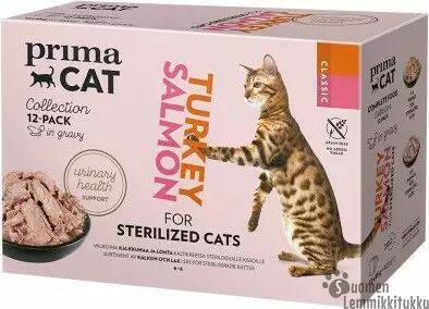 Kissasi on lihansyöjä ja tarvitsee ruokavalioonsa runsaasti lihaa voidakseen hyvin. PrimaCat Classics -sarjan tuotteet ovat 88 % eläinperäisiä. PrimaCatilla tiedetään, että kissan ruokinta on taitolaji; siksi he loivat erityisen herkullisen reseptin, jota kissasi on lähes mahdoton vastustaa. Kissalla on luonnostaan heikko janontunne, joten on tärkeää, että kissa saa ravinnostaan tarpeeksi nestettä. Siksi tuote sisältää lihaisia aitoja lohi- ja kalkkunafilepaloja ja kastiketta tarkoin suunnitellussa 50/50-suhteessa.