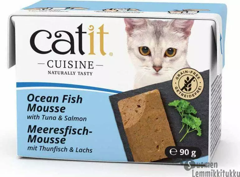Sisältö: Valkoinen kala (26%), kana, tonnikala (4%) lohi (4%) lohiöljy, kivennäisaineet, hydrolysoitu kalaproteiini.