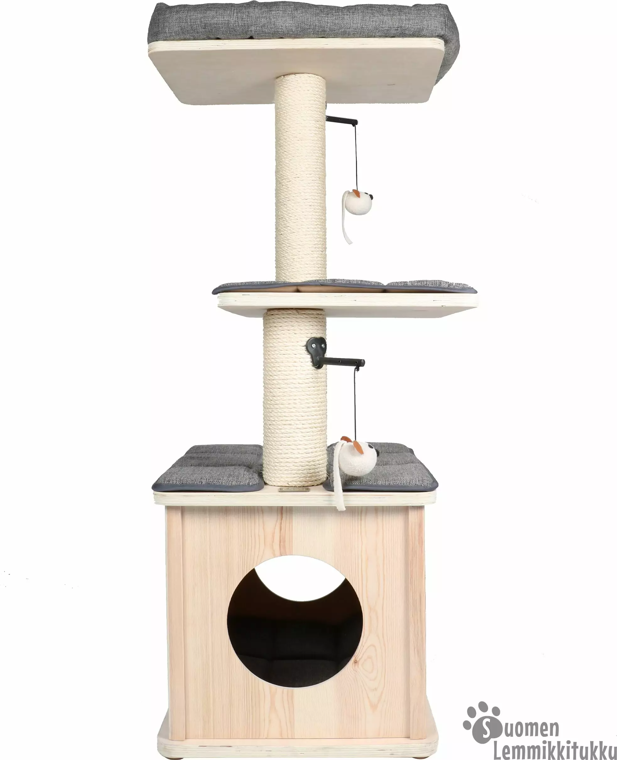 Ebi Oslo-raapimapuu on tyyliltään ja väritykseltään skandinaavisen hillitty ja siinä onkin käytetty osin puuta (käsittelemätöntä mäntyä), joka on yhdistetty luksuskankaisiin. Pehmusteet on kiinnitetty tarranauhalla je ne voi pestä. Oslo-raapimapuusta läytyy alaosasta mukava pesäluola sekä kolme tasoa, joiden päällä on mukavaa loikoilla. Suosittelemme Ebi Osloa pienille tai korkeintaan keskikokoisille kissoille.