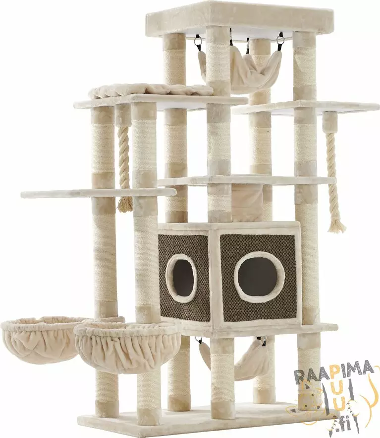 Jopa 11 cm vahvat tolpat! Runsaasti makuu- ja oleskelutasoja kissallesi. Mukavan pehmeät pesät ja ihanat riippupussukat kissasi rentoutumishetkiin.