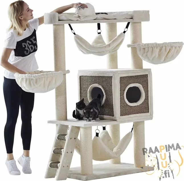 Juanissa on ylhäällä iso lepolautanen pehmusteella. Lisäksi tästä mahtavasta raapimapuusta löytyy iso pesäluola kaksi riippumattoa ja riippupedit sekä tikkaat.
