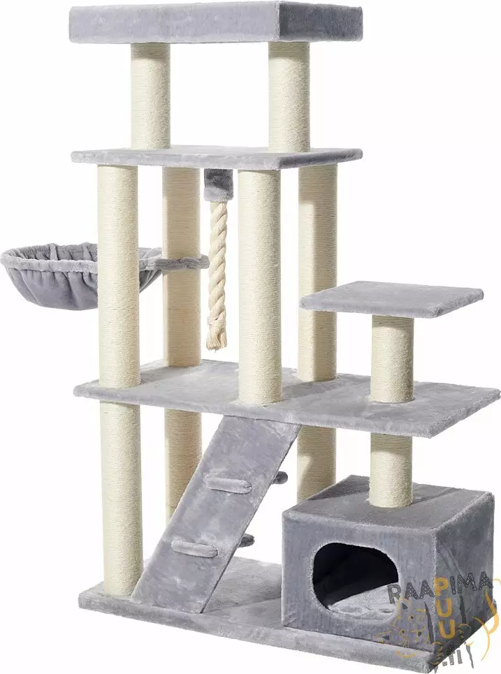 Vaaleanharmaata plyyshiä ja kermanvaaleita tolppia yhdistelevä Kilis raapimapuu on suurikokoinen, laadukas ja tukeva kiipeilyteline kissoille. Kilis tarjoaa useilla kiipeily- ja makuutasoilla, pesämökillä ja riippupedillä mukavasti vaihtelua kissallesi ja se sopii myös useamman kissan talouteen. Kiliksen pohja on 100x50cm eli se ei mahdu ihan pieneen tilaan.