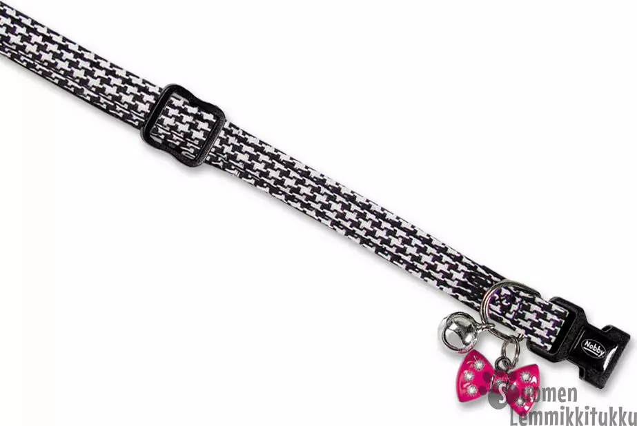 Kissan kaulapanta tyylikkäällä Pepitaruutukuviolla vienosti kilisevällä pikkuruisella kellolla. Lisäksi pannassa on hemaisevan pinkki muovinen rusettikoriste - Pikalukko - Pituus... Lue lisää