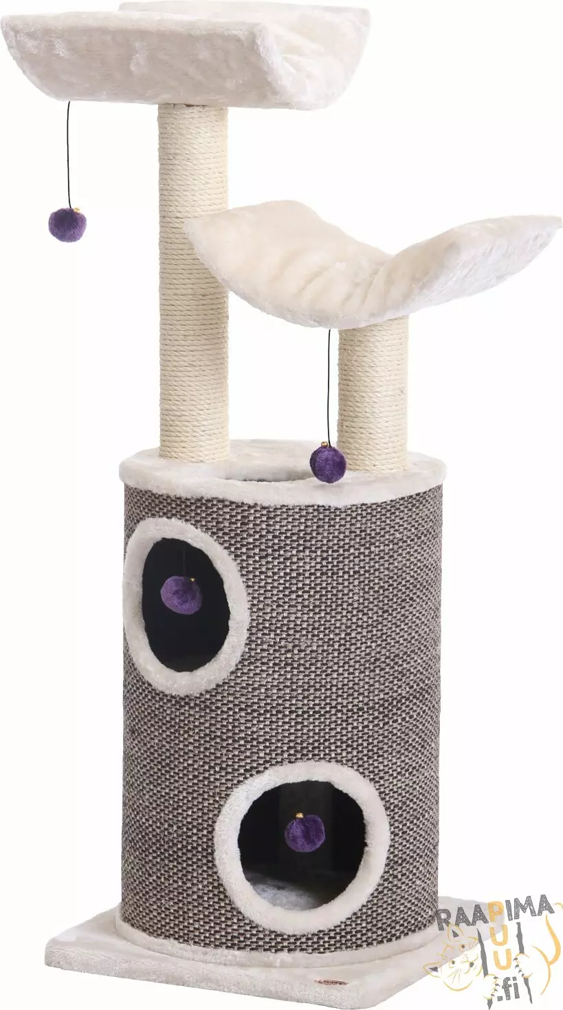 Raapimispuun ja -tynnyrin yhdistelmä Kaduna Plus seisoo 45x45cm alustalla ja sen korkeus on vain 118 cm. Sisalrunkojen halkaisija on 9 cm. Kadunassa on kaksi loikoilupaikkaa ja tynnyriosassa on kaksi koloa eli pienestä koostaan huolimatta Kaduna tarjoaa kissallesi mukavasti vaihtelua.
