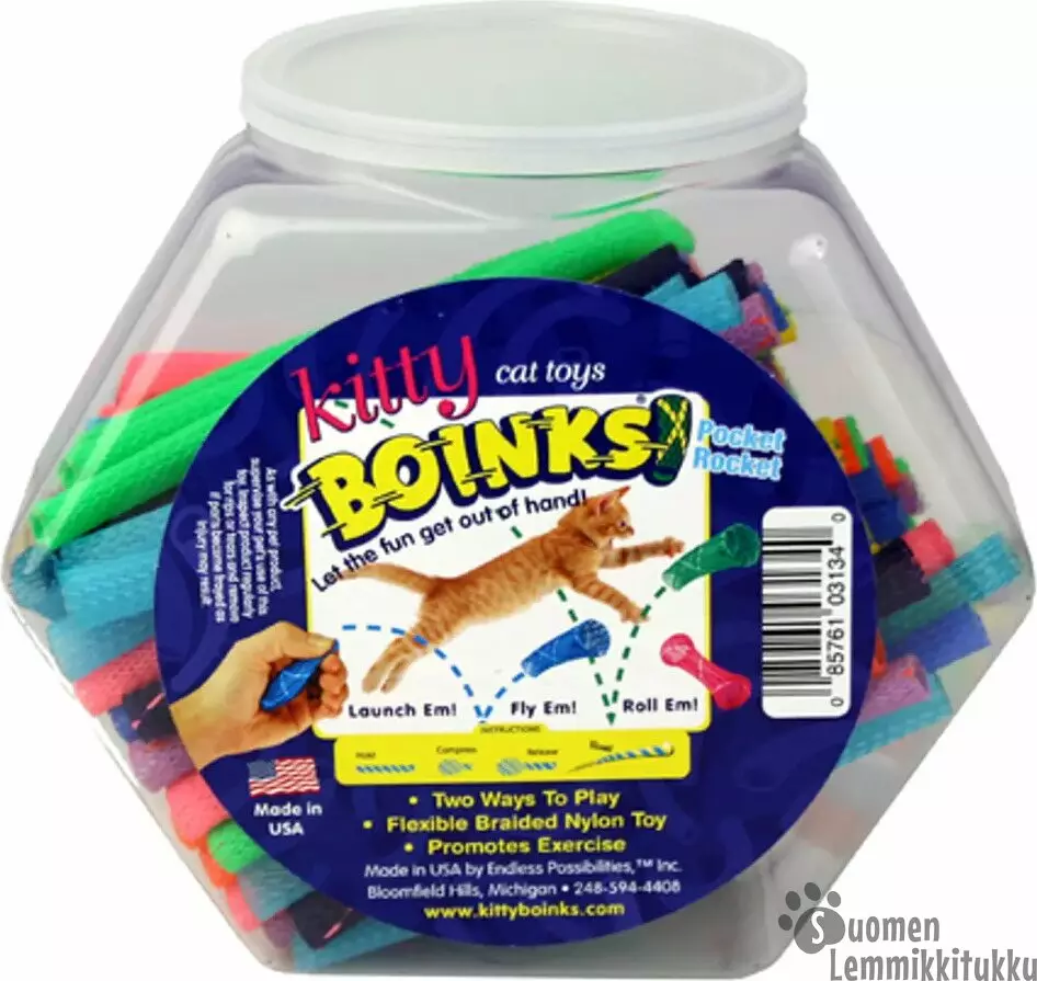 Tee kissastasi jälleen pentu Kitty Boinksin avulla. Kitty Boinks on kätevä joustava tuubijousi, joka saa kissasi ihan villiksi. Puristamalla lelua ja irrottamalla otteen sinkoat tuubin kauas. Kitty Boinks on kevyt ja lentää hyvin kissasi heitellessä sitä. Kissat eivät vain saa tarpeekseen tästä lentävästä tuubiraketista.