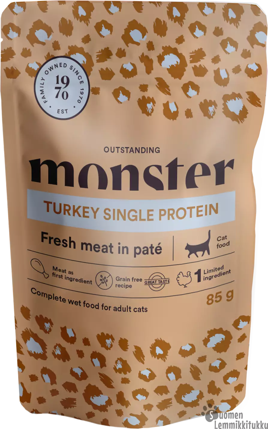 Monster Cat single Turkey on yhden proteiinin annospakattu säilykeateria aikuisille kissoille. Tässä ruoassa on lihana pelkästään Kalkkunaa (60%). Onko se kissasi suosikkimaku?