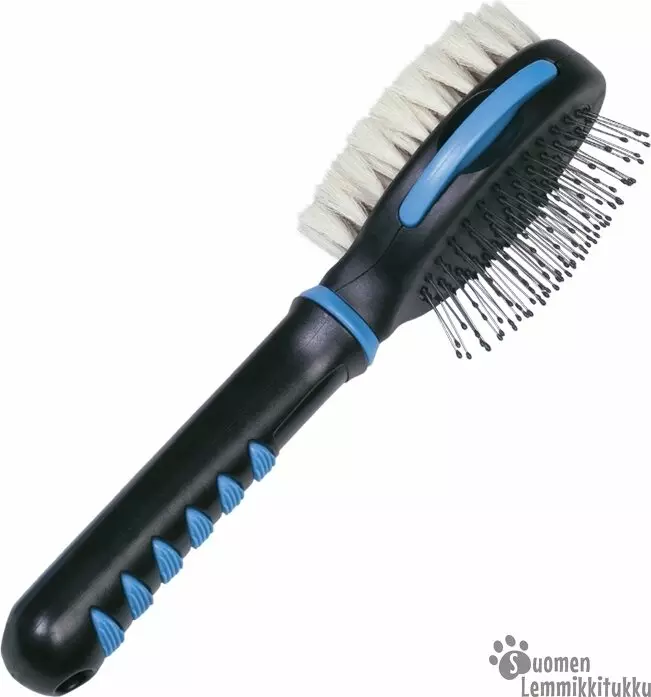 Nobby Comfort Line kaksipuoleinen harja sopii etenkin pennuille ensiharjaksi. Toinen puoli on mukavan pehmeä jarja, jolla on hyvä aloittaa harjamiseen totuttelu. Toisella puolella on perinteinen harja teräspiikeillä. Piikkien päissä on muoviset nupit ja pohja on joustavaa kumia. Harjassa on napakka soft grip varsi, josta saa hyvän otteen.