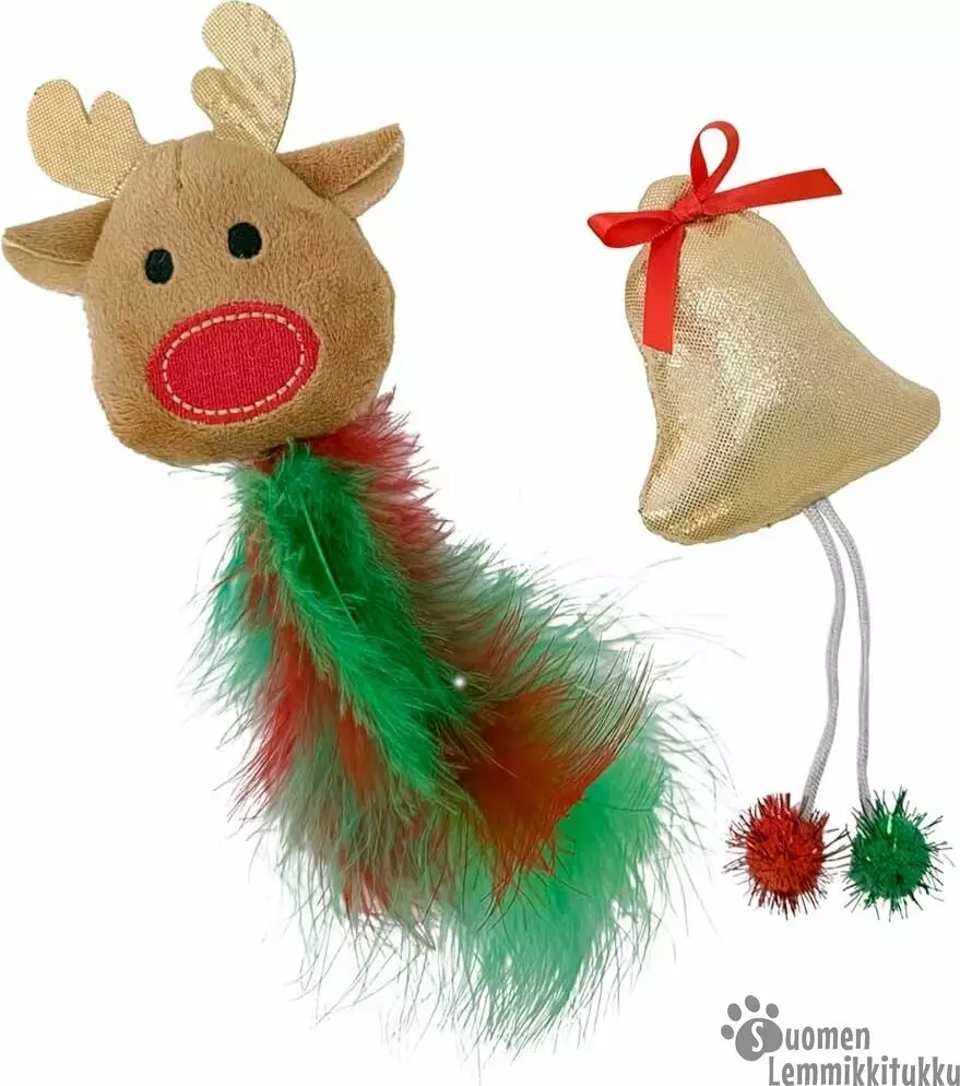 Ihana jouluinen lelusetti, jossa on suloisen pehmeä poro ja kello houkuttelevalla höyhenhännällä tai palloilla. Nämä joululelut ovat sopivan pieni, että se on kevyt "heitellä". Lelussa on lisähoukuttimena monen kissan suuresti rakastamaa kissanminttua.