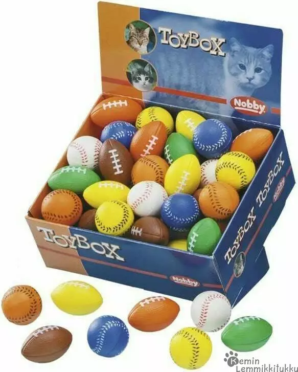 Kissan vaahtomuovipallo pomppii ja on pehmeä lelu, joka houkuttaa kissaasi jahtiin. Palloista osa on pyöreitä ja osa rugbypallon muotoisia.