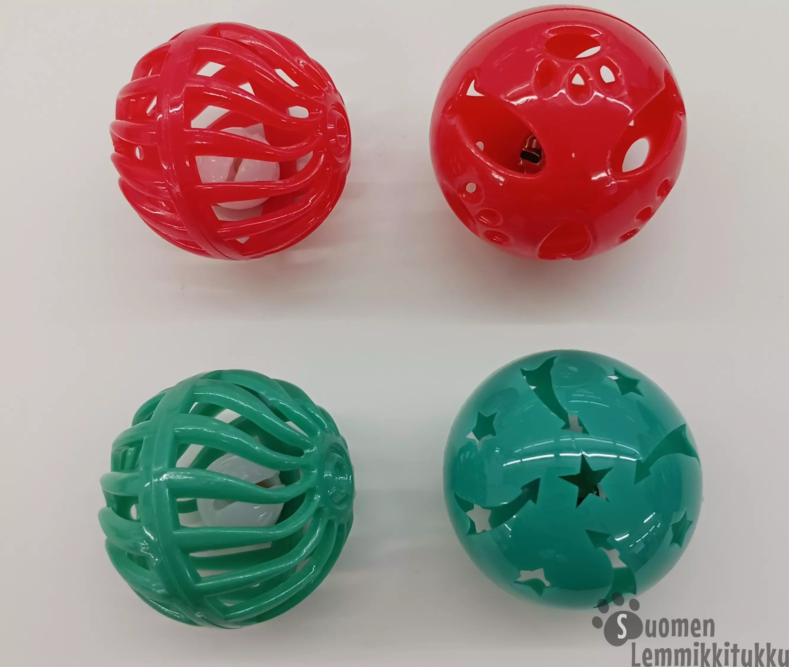 Kissan muovireikäpallo helistimellä on mukavan kevyt ja sopivan pieni lelu kissallesi. Kevyttä palloa on helppo vieritellä ja heitellä leikeissä. Sisällä on vienoääninen tiuku. Värilajitelma, lopullinen väri määrytyy varastotilanteen mukaan. Pallon halkaisija on n. 4cm