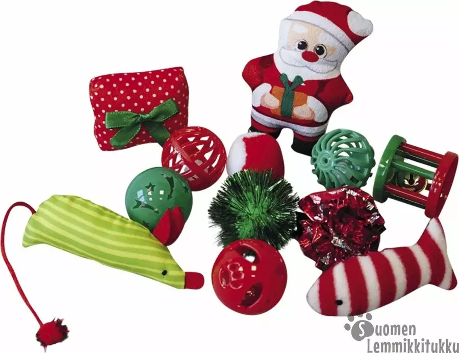 Nobbyn kissan lelusetin kanssa perheen silkkitassu viihtyy mukavasti koko joulun. Tässä mahtavassa lelusetissä on hyvä valikoima erilaisia pieniä leluja kissalle: kilisevää, rapisevaa ja pehmeää. Lelut on pakattu muovirasiaan, joten se on helppo pakata joulupaperiin ja viedä vaikkapa kissaperheeseen tuliaisiksi.