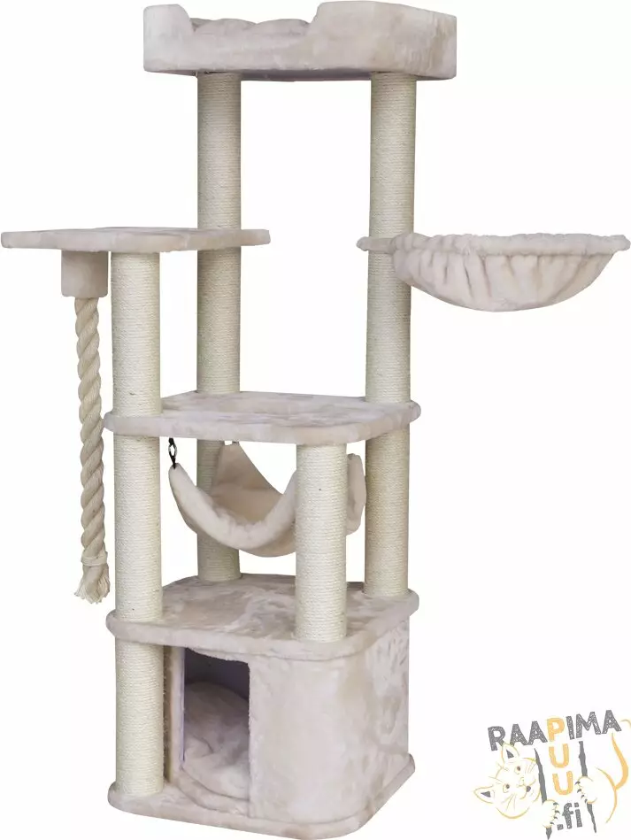 Tämä monipuolinen raapima- ja kiipeilypuu seisoo tukevasti 50x50cm pesäkolon päällä neljän paalun varassa ja tarjoaa kissoille useita mukavia lepäily- ja ajanvietepaikkoja sekä pesäluolan ja riippumattopedin. Zadassa on lisäksi paksu köysi, jota pitkin voi myös kiipeillä.