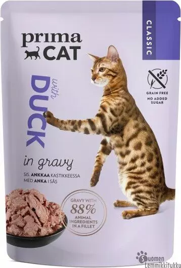 PrimaCat Ankkaa kastikkeessa -annospussit ovat helppo tapa tarjota kissallesi päivittäin ravitseva annos lihaisaa täysravintoa. Pussissa on puolet herkullista kastiketta, puolet meheviä ankanmakuisia lihasuikaleita. Eläinperäisen proteiinin saannista on huolehdittu valmistamalla lihasuikaleet 88 %:sti liha- ja eläinperäisistä raaka-aineista. Hyvin sulava ankka houkuttelee nirsommankin kissan ruokakupin äärelle. Lisäksi reseptimme on viljaton, eikä se sisällä maissia, soijaa tai geenimuunneltuja ainesosia. Tuotteemme eivät sisällä kissalle tarpeetonta lisättyä sokeria.