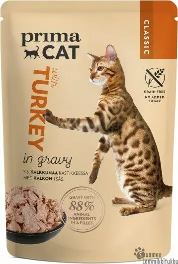 PrimaCat Kalkkunaa kastikkeessa -annospussit ovat helppo tapa tarjota kissallesi päivittäin ravitseva annos lihaisaa täysravintoa. Pussissa on puolet herkullista kastiketta, puolet meheviä kalkkunanmakuisia lihasuikaleita. Eläinperäisen proteiinin saannista on huolehdittu valmistamalla lihasuikaleet 88 %:sti liha- ja eläinperäisistä raaka-aineista. Herkullinen kalkkuna houkuttelee nirsommankin kissan ruokakupin äärelle. Lisäksi reseptimme on viljaton, eikä se sisällä maissia, soijaa tai geenimuunneltuja ainesosia. Tuotteemme eivät sisällä kissalle tarpeetonta lisättyä sokeria.