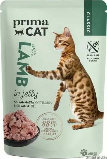 PrimaCat Lammasa hyytelössä -annospussit ovat helppo tapa tarjota kissallesi päivittäinen ruoka-annos herkullista, maistuvaa täysravintoa. Tuotteessa on puolet herkullista kastiketta, puolet meheviä lampaanmakuisia lihasuikaleita. Lihasuikaleet ovat 88 %:sti liha- ja eläinperäistä raaka-ainetta. Lisäksi resepti on sokeriton ja viljaton.