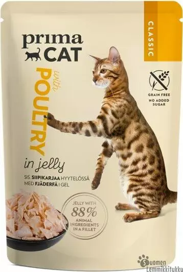 PrimaCat Classic -sarjan viljaton märkäruoka sisältää runsaasti lihaa hyytelössä tai kastikkeessa. Annospussit ovat kissan täysravintoa, jonka herkulliset lihasuikaleet ovat 88 % eläinperäisiä, eivätkä sisällä lainkaan lisättyä sokeria. Kissalla on luonnostaan heikko janontunne, joten on tärkeää, että kissa saa ravinnostaan tarpeeksi nestettä. Siksi tuote sisältää lihaisia suikaleita ja kastiketta tai hyytelöä tarkoin suunnitellussa 50/50-suhteessa.