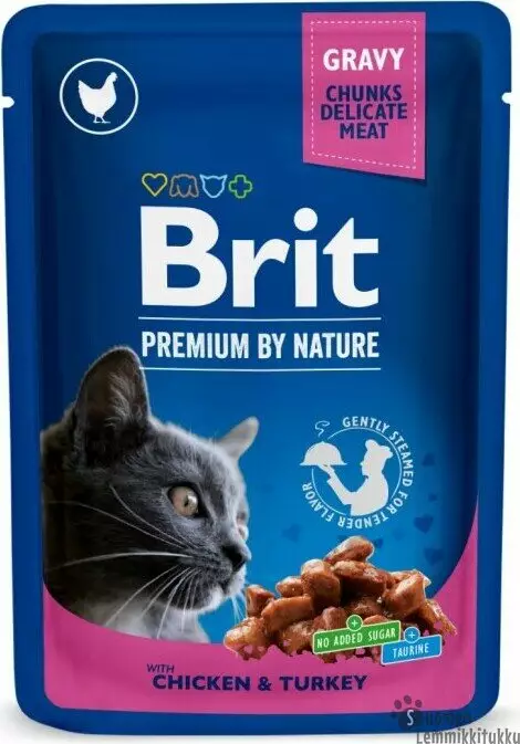 Premium-laatuista täysravintoa aikuisille kissoille kätevässä annospussissa. Brit Premiumin eläinkauppatasoinen märkäruoka sisältää kanaa ja kalkkunaa herkullisessa kastikkeessa. Annoksen lihaisuus houkuttelee kissan helposti ruokakupin ääreen nauttimaan hyvää tekevää ruokaa. Brit Premium -ruoat on suunniteltu kissan hyvinvointi edellä, luontainen ravinnontarve huomioiden. Annospussit eivät sisällä lisättyä sokeria eivätkä keinotekoisia väri- tai säilöntäaineita.