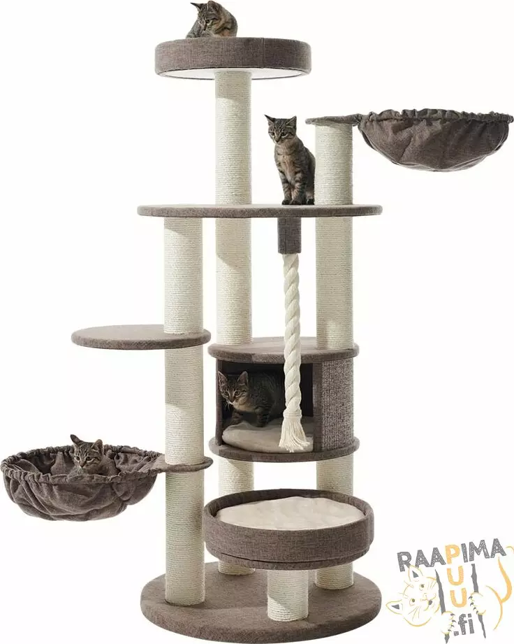 Laadukas ja tukeva Nobby Fida on harvinaisempaa pyöreää mallia. Fidan pohja on pyöreä ja halkaisijaltaan hurjat 70cm, myös tasot ovat pyöreitä. Fidassa on kissallesi useita tasoja eri korkeuksilla ja pyöreä mukava pesäkolo. Tasoilla on mukavat pehmeät tyynyt samoin kuin pesäkolossa.