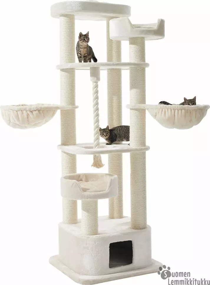 Upea ja näyttävä kiipeily- ja raapimispuu Musan tarjoaa huonetiikerillesi paikan kiivetä ja kynsiä mutta myös lukuisten makuumahdollisuuksien ansiosta oivan lepopaikan. Tämä upeus seisoo tukevasti 70 x 70 pohjalla ja on hulppeat 203 cm korkea. Raapimispaalut on verhoiltu sisalilla ja ovat erityisen leveitä (Ø 12 cm) ja siksi erityisen vakaita. Kissapuussa on alaosassa hieno luola, kaksi sänkyä ja monta pehmustettua tasoa. Musan on varustettu myös 60 cm pitkällä köydellä, joka myös stimuloi leikkiä.