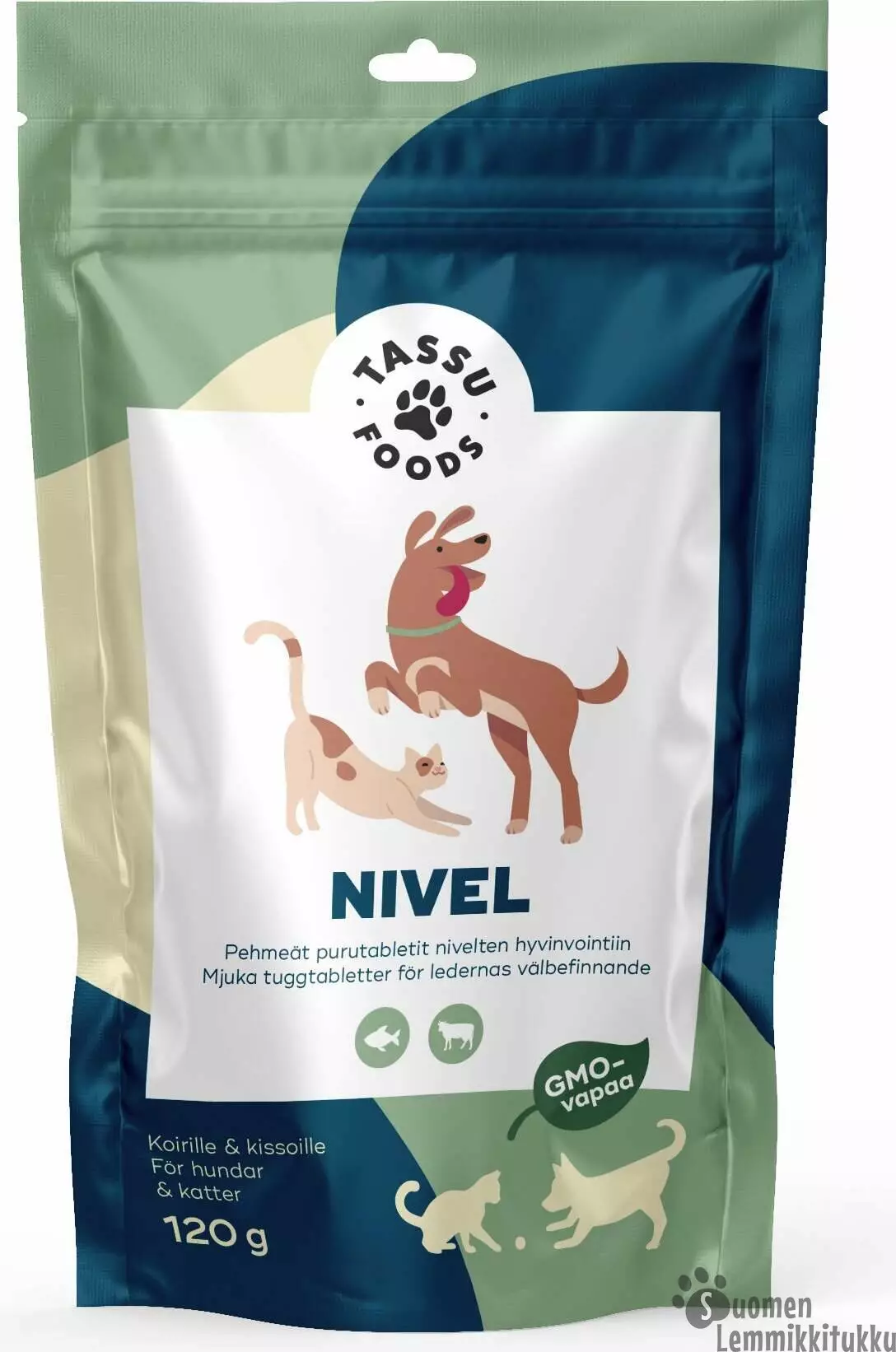 Tassu Foods Nivel on suunniteltu täydentämään koirien ja kissojen perusruokintaa ja se sisältää lemmikin päivittäin tarvitsemia ravintoaineita. Tuote sisältää mm. Harpagojuurta, viherhuulisimpukkaa, kollageenia, glukosamiinia, hyaluronihappoa, C-vitamiinia ja MSM:ää.