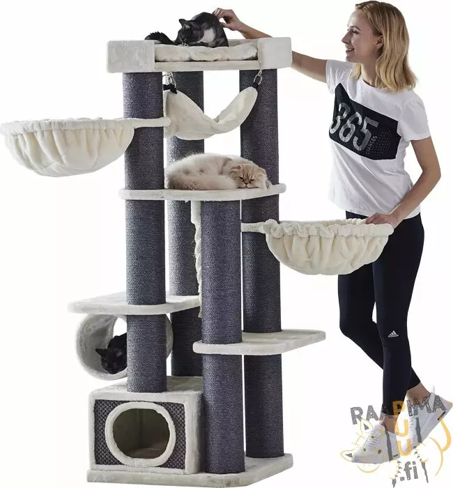 Todella monipuolinen ja tukeva Chilo tarjoaa kaiken, mitä kissan sydän haluaa. Yksinkertainen muotoilu, mahtavat makuualueet ja sisal-runko tekevät kissanpuusta paitsi ihanteellisen paikan leikkimiseen ja nukkumiseen mutta myös koristeellisena huonekaluna.