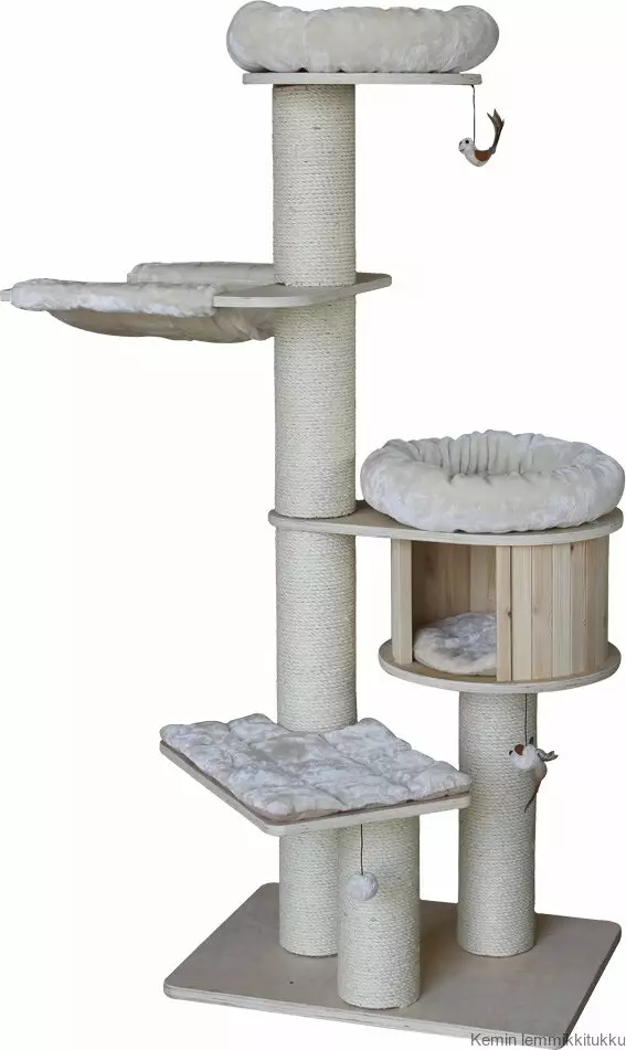 Kissan raapimapuu Odun seisoo tukevasti kolmella paksulla tolpalla 76x56cm alustalla ja se on 176cm korkea. Raapimapuu Odun sopii isommallekin kissalle sillä sen paalut ovat vahvat 15cm halkaisijaltaan. Odunissa on monia erilaisia pintoja, tasot on vaneria mutta pedit ovat pehmeätä plyyshiä. Odunin riippumatto on myös takuulla monen kissan lempparipaikka. Raapimapuu on myös varustettu puisella luolalla, jossa kaikki puiset elementit ovat vaneria. Kissaasi vuuhdyttävät myös Odunin kolme veikeää lelua: lintu, hiiri ja pallo