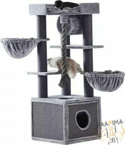 Tukeva raapimispuu Adile tarjoaa kissallesi kaiken, mitä kissasi raapimapuulta voi toivoa. Yksinkertainen muotoilu ja värit harmaasävyissä tekevät Adilesta paitsi ihanteellisen paikan kissoillesi leikkimisessä ja nukkumisessa, myös koristeellisen huonekalun asuntoosi. Viihtyisät tasot, iso tyynyllä varustettu lautanen ja erityisen suuri luola tarjoavat viihtyisän lepopaikan myös isoille ja raskaille kissoille. Lisäksi Adilen leikkiköysi, sisalrungot ja sisalpinnoilla varustettu luola takaavat mukavaa ajanvietettä ja tarvittavaa kynsihoitoa.