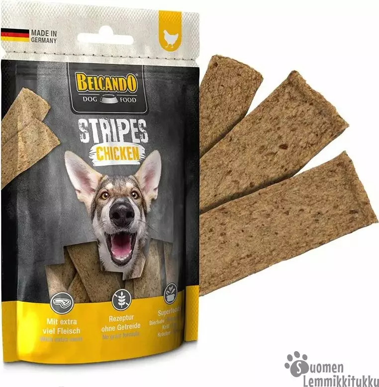 Belcando Stripes, vastustamattoman herkullista lihaa ja terveellisiä superfoodeja (krilli, yriti ja panimohiiva). Erittäin lihaiset Stripes herkut on luonnollisesti "Made in Germany".