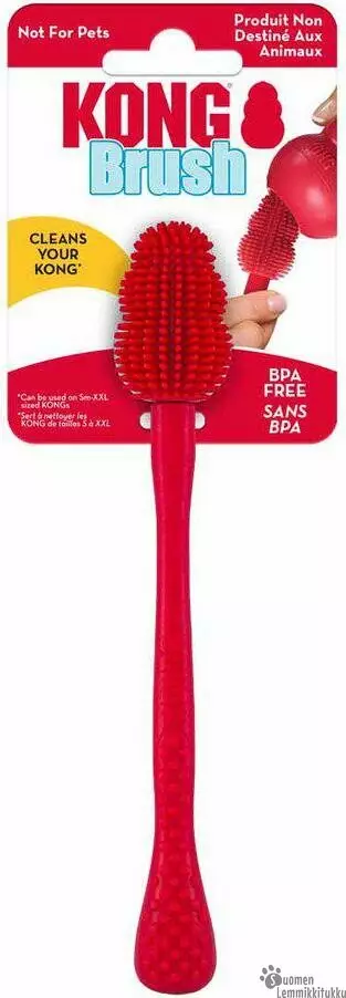 KONG Brush tekee KONG Classic -muotoisten lelujen puhdistamisesta nopeaa ja helppoa, koska taitavimmallekin koiralle saattaa jäädä joku kohta huomaamatta. Puhdistamalla lelun tällä harjalla huolehdit, että koirasi lelu pysyy hygieenisenä ja säilyy paremmin.