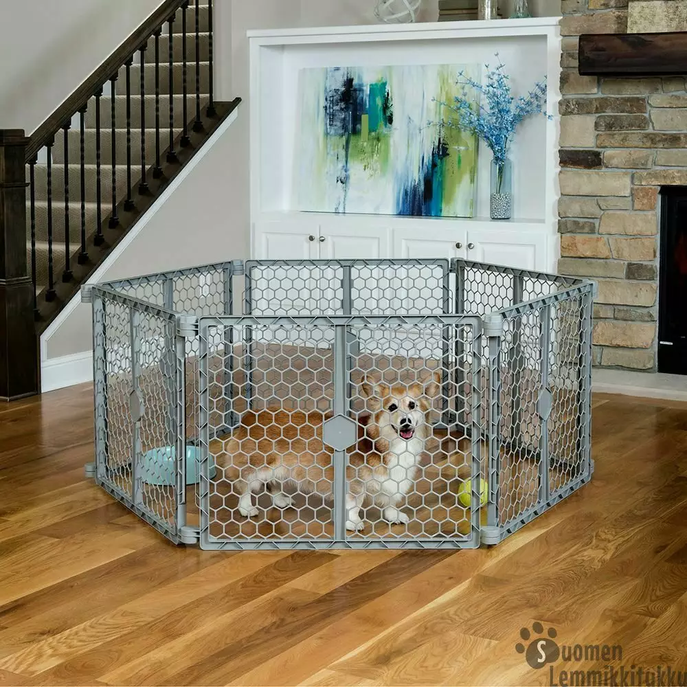 Monikäyttöinen aita, jota voit käyttää porttina tai pentuaitauksena. Kevyellä ja helposti kasattavalla aidalla saa helposti rajattua leveitäkin oviaukkoja asunnossa. Aidan voi helposti ja nopeasti muuttaa myös pentuaitaukseksi. Vaivattomasti käänneltävien kuuden paneelin ansiosta aidan saa istumaan haastavimpiinkin paikkoihin.