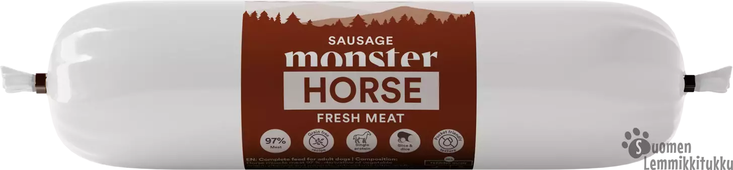 Koostumus: Hevosenliha 97 %, kasviperäiset tuotteet, vitamiinit ja kivennäisaineet, hapettumisenestoineet (sitruunahappo), karrageeni.