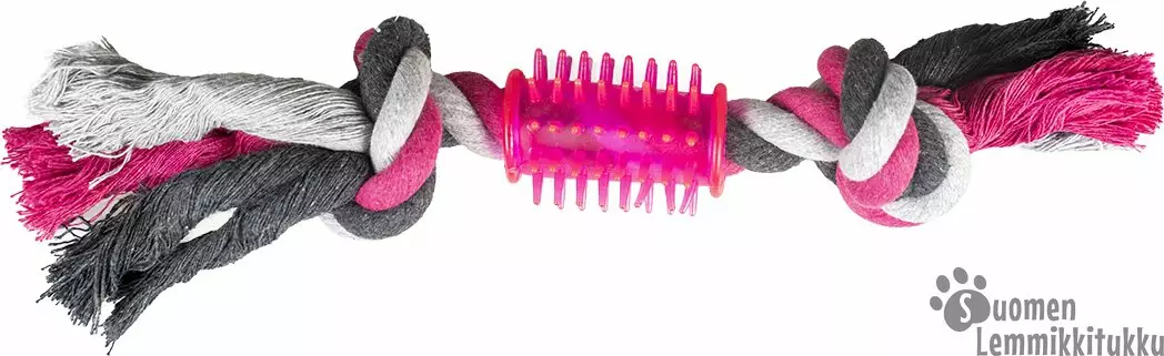 Duvo+ köysilelussa on kahden solmun välissä kuminen purulelu, josta pn mukavaa tarttua kiinni. Keskellä olevassa kumilelussa on piikkejä, jotka helpottavat esim pentukoirilla ikenien kutinaa ja samalla puhdistaa hampaita. Sopii kaikille koirille. Voit käyttää lelua sekä veto- että hakuleikkeihin.
