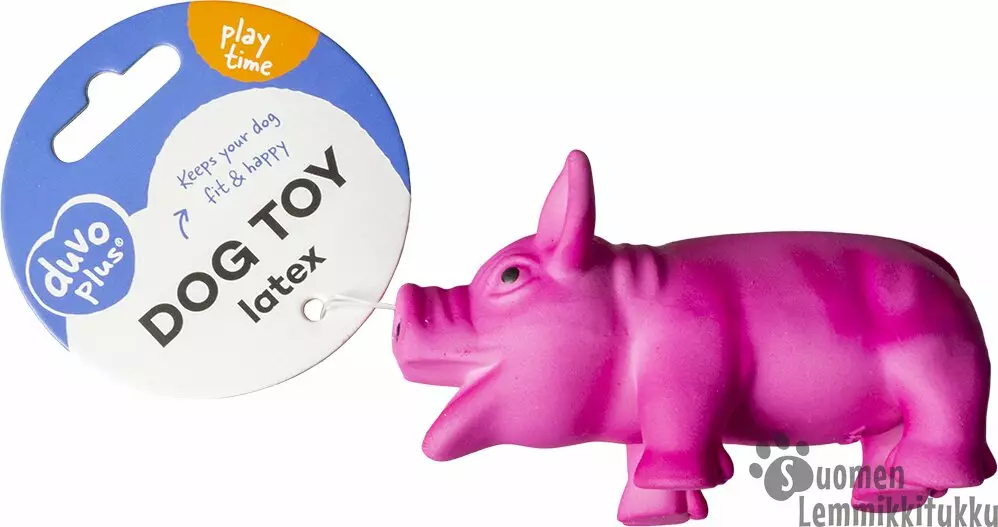 Mitat tällä pienehköllä possulla on 10cm pituutta ja korkeutta n. 10cm eli se sopii pienelle tai keskikokoiselle karvatassulle erinomaisesti. Possun sisällä on vinku ja vanutäyte ja materiaali on latexkumia.