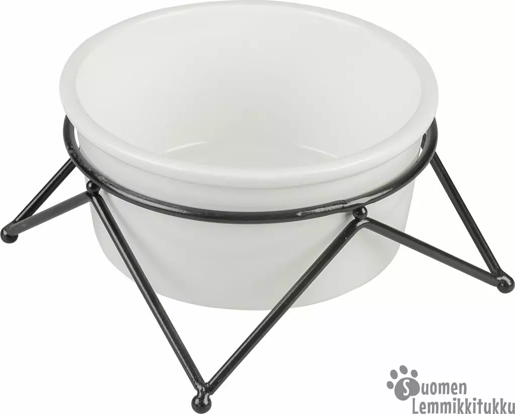 Duvo+ ZigZag-ruokakuppi on tyylikäs keraaminen kuppi. Ulkonäön viimeistelee mustaksi maalattu teräksinen teline. Kupin voi irrottaa telineestä nostamalla.
