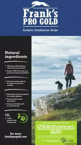 Korkealaatuisista raaka-aineista valmistettu Frank’s Pro Gold Maintenance on maistuva, kanapohjainen täysravinto, joka on suunniteltu työ- ja harrastuskoirien lepokauden ravinnoksi sekä vähemmän aktiivisille koirille perusravinnoksi. Ruoan rasvapitoisuus on 10% ja siinä on paljon kuituja.