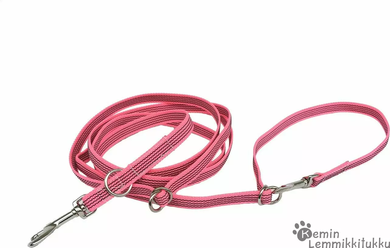 Monitoimihihnassa lukot molemmissa päissä ja liikuteltavat välirenkaat (2kpl) keskellä ja lisäksi kiinteä rengas hihnan alussa.