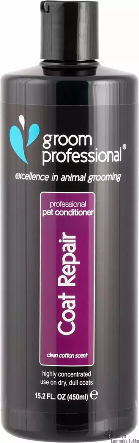 Groom Professional Coat Repair Conditioner on ainutlaatuinen huuhdeltava hoitoaine, joka on suunniteltu erityisesti kuivan, vaurioituneen ja elottoman turkin hoitoon. Tehokas hoitoaine palauttaa turkin luonnollisen rakenteen, rakentaa sen uudelleen ja lisää kiiltoa. Sopii erinomaisesti pitkäkarvaisille roduille, jotka ovat erityisen herkkiä karvan katkeamiselle.